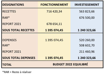 Les investissements, intégrant le "reste à réaliser" (RAR) de 2021, concernent surtout la fin du chantier de l’école. Mais nous prévoyons aussi, vers la fin de l’année, le début de travaux de sécurité sur la D46 ainsi que quelques nouvelles plantations d'arbres.